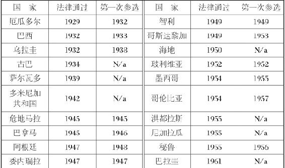 政治制度的变化。拉美政治中的权力平衡正在改变,罗马天主教会、军队、土地寡头的权力已经衰落,而商业、银行、制造业、政治精英和中间阶级的影响在扩大。一些新的政党诞生了,它们经常是按照新的意识形态原则组织起来的,并且具有比较广泛的群众基础。大规模的工人、农民、大学生和专业人员的组织也出现了。越来越多的充满竞争性的和多元化利益群体的社会在形成。工业化和城市化改变了妇女的政治地位,拉美主要国家的妇女在20世纪60年代初基本都赢得了选举权(见表8)。从20世纪70年代末以来开始的拉美国家民主化浪潮使军人政权纷纷下台,到90年代初整个大陆已变成清一色的文人民主政体。目前在所有国家中都能保持正常的选举和至少形式上的民主,民众的参选率在50%以上,民主得到鼓励,从测量范围在0-1之间的民主选举指数看,1977年拉美为0.28,1985年上升到了0.69,1990年上升到了0.86,2002年更达到了0.93.同样地,人权的情形在大多数国家比20多年前也得到了显著地改善,公民的各种权利与自由在法律上得到普遍承认。