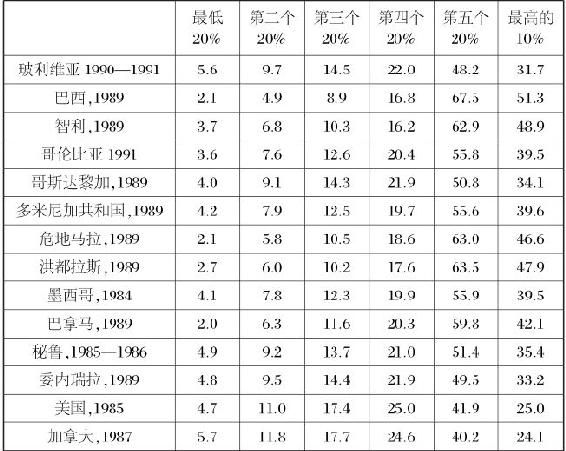 大多数财富仍然被集中在精英和中产阶级手中,只有很少“分润”给穷人。收入分配是一个国家阶级结构的指示器,不同的社会阶层具有不同的收入水平和消费模式。表6显示了最底层的20%的人口收入占总收入的比例,并且将这一数据与其他几个组别作了比较。“在拉美最大的四个国家里(巴西、墨西哥、阿根廷和智利),60年代末70年代初,最富有的1/5的人口持有一半以上的财富收入,到80年代中期,这种情况几乎没有发生变化。与之比较,最贫穷的1/5的人口仅持有不到总收入的5%的财富。”
