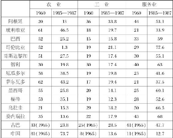 拉美的城市化的速度超越了工业部门吸纳劳动力的能力,把隐性失业由农村转向了城市服务业部门。从就业结构分析,表5显示了在农业、工业和服务业三大经济部门中劳动力的分布比例。但“服务业”是一个含义十分模糊的类别,在拉美,大多数服务业工作的工资待遇低,而且经常是在街头和贫民居住区的临时性工作。从表中可以看出,虽然1960-1988年间,巴西、厄瓜多尔以及哥伦比亚的工业就业增加了,但这种增长主要是以牺牲农业为代价的。事实上,这一时期每个国家的服务业部门的就业也都增长了,墨西哥增长了35个百分点,在阿根廷和巴西也都有所增长。这些数字提醒我们,在拉丁美洲工业化较为发达的社会中,1982年后由于国内市场狭小以及经济衰退,存在着对工业扩张的限制。来自巴西的估计认为,在像圣保罗和里约热内卢这样工业化的城市中,在“非正规经济”中工作的劳动力不超过1/3,但是,在其他许多城市,包括南部以及东北部的城市中,非正规部门的就业大约占了就业总数的2/3.其他拉美国家也有类似的情况。