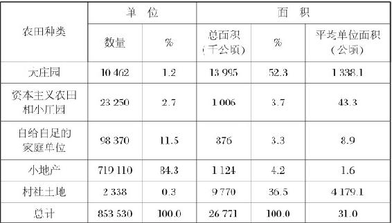注释:a.小地产是指能维持一个家庭的农田,包括位于庄园内的小块土地和在村社内的小块私有土地;b.村社土地几乎全部是高海拔的崎岖的草地。资料来源:马托斯·马和梅希亚:《秘鲁的土地改革》,转引自迈克尔·里德《秘鲁:通向贫困之路》,第36页。