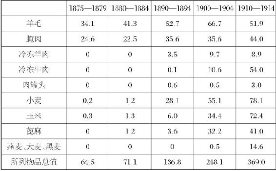 表4.1 1875-1914年阿根廷主要出口品(1910-1914年价格的年均百万金比索)