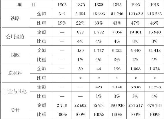 表4.5 1865-1913英国对阿根廷投资的构成(单位:1000英镑)