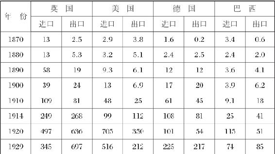 这一时期阿根廷出口市场相对而言也是比较多样化的。尽管英国是它的主要贸易伙伴,但阿根廷与美国、德国、法国和巴西等其他国家的贸易往来也有了很大发展(参见表4.2)。例如,1870年阿根廷从英国和美国的进口值分别是1300万比索和290万比索,到1914年,这两个数据分别上升到2.49亿比索和9900万比索,到1920年,美国对阿根廷的出口(7.05亿比索)已经超过了英国对阿根廷的出口(4.97亿比索)。另一方面,我们以1913年为例,阿根廷与拉美地区其他主要国家相比,其出口市场的多样化更加明显。阿根廷对4个主要贸易伙伴的出口不超过其出口总值的50%,而对同样的出口对象墨西哥和古巴的比重均超过了90%,智利和秘鲁在80%以上,拉美的第二个出口大国巴西的比重也在70%以上(具体数据参见表4.3)。