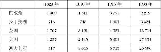 总体看来,在经历了初级产品出口繁荣的“黄金时代”之后,阿根廷成为当时世界上少数比较成功的国家之一。笔者认为,仅从人均GDP比较的角度即可清楚地体会到阿根廷的相对成功(参见表4.4)。那么,是什么因素推动着阿根廷早期现代化进程的快速发展呢?