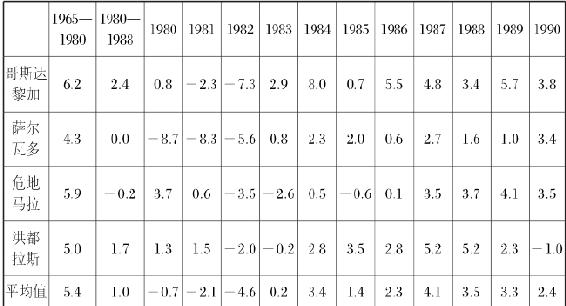 周期性的繁荣与萧条是世界经济运行的基本特征。70年代石油输出国组织提高石油价格直接诱发了世界经济的滞胀危机。工业化国家对初级产品的需求下降,初级产品的价格大幅度下跌对中美洲出口部门造成巨大的冲击波。从1980年到1985年间,除了哥斯达黎加外,中美洲国家的出口呈负增长。洪都拉斯出口年均增长率为——7.2%,萨尔瓦多为——5.3%,尼加拉瓜为——2.9%,危地马拉为——1.3%,哥斯达黎加为0.3%。出口的下降直接影响了进口能力。在50年代到60年代的工业化阶段,工业的进口替代形成了逐渐依赖进口原材料、中间部件和资本货的过程。在出口收入减少、资本投入不足、生产增长率下降的综合性危机的打击下,国民经济陷入倒退。如表二所示,与80年代前的20年相比,中美洲国家国民生产总值的增长出现大幅衰退,危地马拉在整个80年代为负增长,萨尔瓦多受战乱的影响经济陷入停滞,即使是经济业绩一向较好的哥斯达黎加,1965-1980年期间,该国的国民生产增长率的平均值为6.2%,1980年骤降到0.8%,1981年为2.3%,1982年为7.3%。