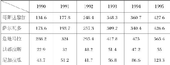 表中资料显示,哥斯达黎加、危地马拉和萨尔瓦多在地区贸易和合作中发挥了积极的作用。以危地马拉为例,从1986年到1990年非传统出口在出口总额中的比重分别为2、6.3、9.7、7.9、14.8,逐年递增的趋势相当显著。如果考虑到哥斯达黎加经济较为发达的背景,可以这样认为,哥斯达黎加在地区经济合作中的参与还有拓展的空间。萨尔瓦多和危地马拉出口占地区内贸易的比重高达60%。洪都拉斯和尼加拉瓜则始终无法扭转贸易逆差,在地区内贸易份额中只占15%。以上数据也反映出中美洲的地区经济一体化发展不平衡的特点。