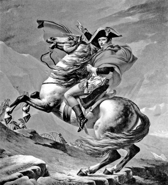 这是拿破仑的“御用”画家大卫(Jacques Louis David)的名作,描绘了1800年5月20日拿破仑取道阿尔卑斯山大圣伯纳山口进攻意大利的场景。不过,拿破仑当时真正的坐骑是一头劣种骡子
