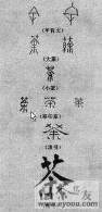 ”、“荈”、“槚”、“蔎”、“诧”、“茗”、“葭”、“葭萌”等说法,其中以“荼”字用得最多,但当时“荼”(见图1-7)是一个多义字,“荼”有时是指苦茶,有时是指茶。后来为了区分苦茶和茶,将指茶的“荼”字加一个“木”字旁,读音一般仍读茶(cha)音。茶文字的规范,自隋代的一本字典性质的书《广韵》开始,它同时收有“荼”、“