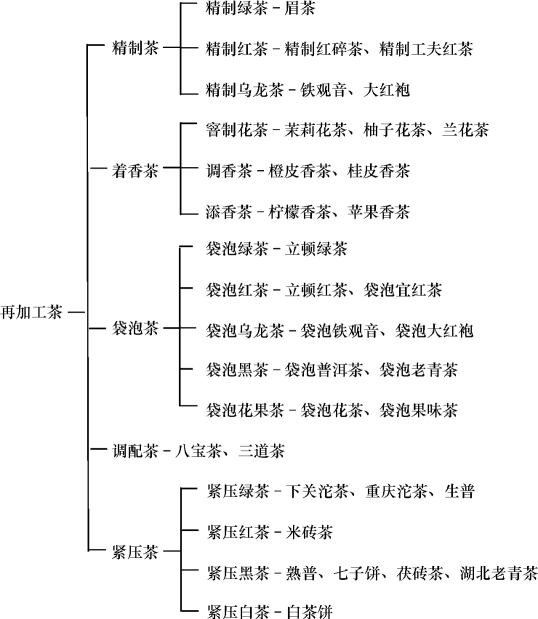 再加工茶是以初加工茶为原料,经特定工艺加工而成,依然基本保留有茶叶形态,但与初加工茶(见图4-7)有明显区别的茶产品。再加工茶主要可以分为以下几类(图4-8):
