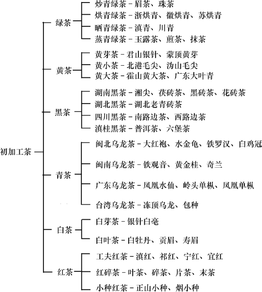 安徽农业大学陈椽教授按制法与品质分类,以茶多酚氧化程度为序,将初制茶分为:绿茶、黄茶、黑茶、青茶、白茶、红茶共六大类(图1)。按发酵与否,茶产品可以分为非发酵茶、前发酵茶、后发酵茶。非发酵茶没有氧化发酵的过程,包括绿茶、黄茶;前发酵茶是指利用鲜叶内含生物酶进行氧化发酵成的,包括青茶、白茶和红茶,青茶和白茶为半发酵茶,红茶为全发酵茶;后发酵茶是指由微生物发酵成的,主要是熟茶型普洱茶、安化黑茶、湖北老青茶等黑茶产品。