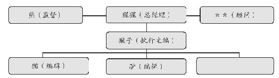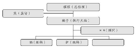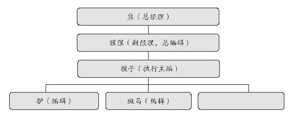 既然谈到管理,就要先说组织。《A》刊的实际组织体系如图a,是典型的直线模式,作为主编的猴子直接负责杂志的日常全部事务并对上级猩猩和熊负责,而熊也直接对大象负责。按理来讲,熊应该将权力下放并要求员工对结果负责,而在实际的运作中,熊过多地干涉了基层的工作,主要原因来自员工的大胆创新和过多的开销。业务优势并不占优的熊,能够靠人脉的力量身居其位实属不易,深谙职场的他肯定想力求稳妥。
