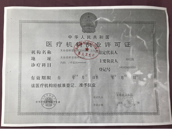 2014年12月太谷刘氏无痛针灸第四代传人陈红梅获得中华人民共和国医疗机构执业许可证