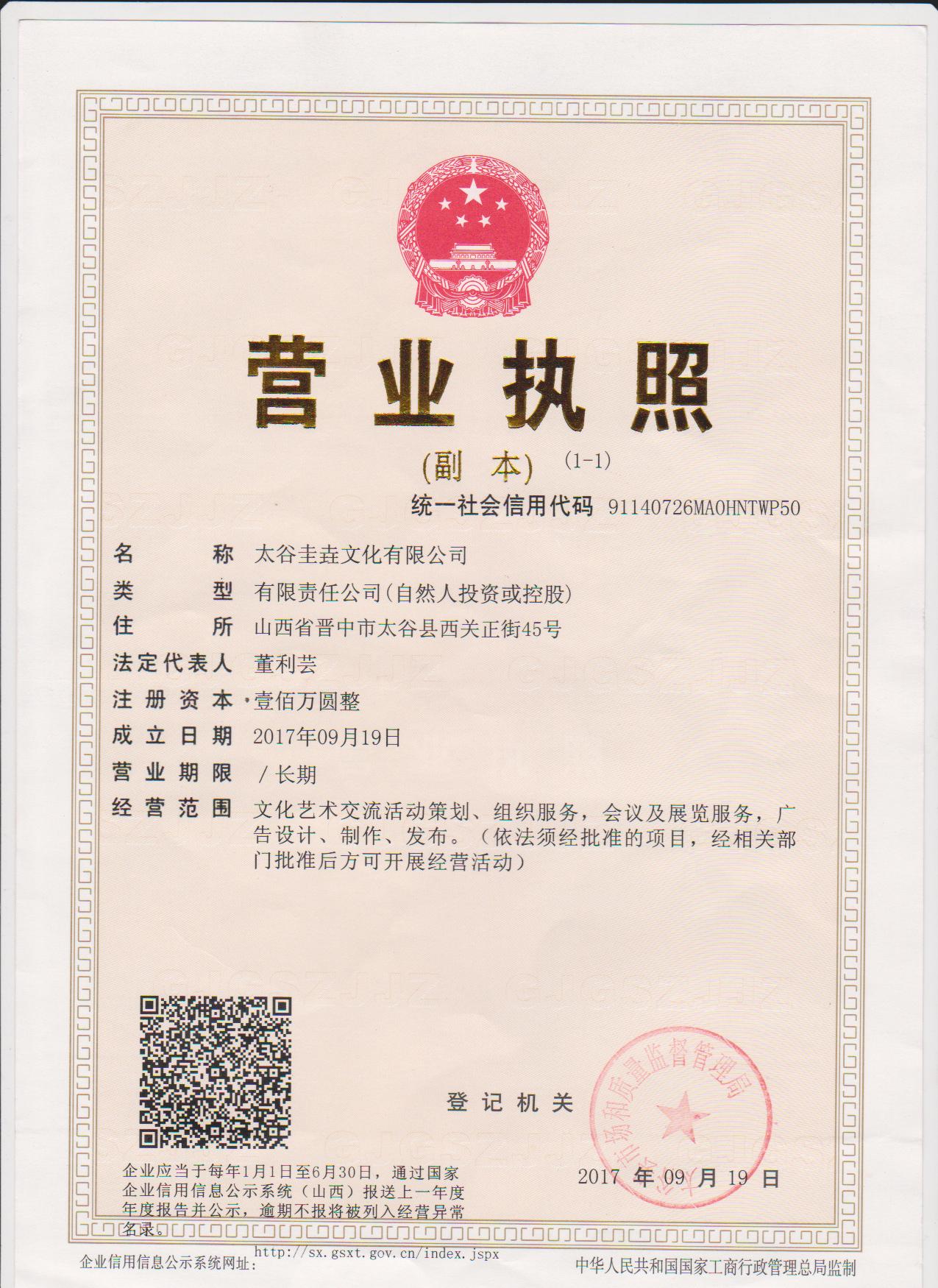 太谷圭垚文化有限公司成立于2017年9月,是一家专业从事文化传播的有限责任公司。本公司致力于非遗物质的保护和恢复,传统文化的传承和发展,是一家旨在宣扬中国传统文化,增强民族自信的文化公司。公司现有员工25名,其中本科学历7名,专科学历12名,技术工人6名。公司现已基本具备信息数字化服务设备。