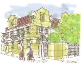 The palladio-style classic architecture was built in 1934 and designed by the famous Scottish architect Sir Clough Williams-Ellis. It has a building area of 1,647 m2. The main and side buildings are arranged in parallel. Two-story brick buildings are symmetrically lined on both sides. To suit the need of social and commercial gathering, the building was designed with public spacing in mind.