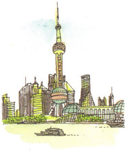 With an elegant name rich in implications, Oriental Pearl is unique and matchless for its grand and beautiful modeling. It is 468 m high, the third highest tower in the world and the highest in Asia. The tower features three major spheres: the upper sphere, and lower sphere and the Space Module. The three supporting columns hold up the tower into the skies. Bus stops, tourist sites, and docks nearby are all adopting the form of spheres. Looked at in the distance, they resemble pearls of all sizes falling into a jade plate.