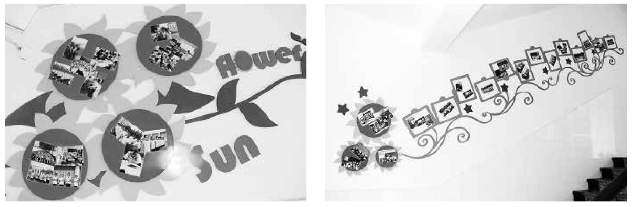 以主题形式物化学校文化。以“名人教育”为主题:在校园内布置了庄严肃穆的蔡元培雕像,建成了蔡元培纪念室、著名教育家长廊、绍兴名人事迹画像、名校友走廊、名人档案廊、名人班班牌、元培小名人宣传栏等。以“温馨美感”为主题:将学校的绿化用地作公园化处理,在绿树下布置优雅的休闲桌椅,以古朴洁净的湖石砌花坛,优化树种和花种,让红花绿叶相间;在崇德楼大厅和每层楼梯平台精心设计图书角,放置最新的图书,配上花卉和漂亮的休闲沙发桌椅,构成一个个温馨优雅的阅读空间;在尚美楼四楼空闲的平台上设计了美观典雅的木质亭台长廊,增添校园的审美文化气息,让学生无论在校园的哪个地方,都能感到美的享受,产生美的感悟。以“厚德”为主题:设计了“厚德墙”和古代崇德小故事墙,将“义、和、礼、孝、仁、信、俭”这些既体现优秀传统文化,又体现社会主义核心价值观的经典文句和小故事漫画置于墙上,给学生以积极向上、文明有礼的道德熏陶,增强校园文化的厚重度和传播度。以“阳光学生”为主题:楼道、走廊等处墙上设计太阳花图案的宣传栏,张贴同学们丰富多姿的校园生活及活动照,设立学生社团作品展区等。