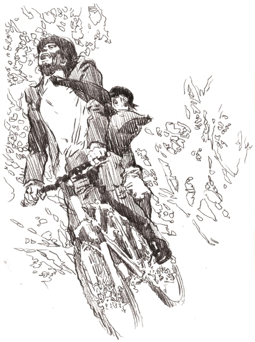 不知道现在到底是什么时候,我向他妥协,坐到了后坐上。伯爵脚踩脚蹬,蹬起了自行车。自行车一路上发出吱吱的声音,有时候车链脱落,发出奇怪的声音,前进的速度非常慢。我心想还是走路去更方便一些,不过被他驮着,也不好说这种话,于是默默地坐在后座上一言不发。一会儿,一处山坡令自行车的速度更加的缓慢,伯爵的呼吸变得越来越急促,最后终于停下了。