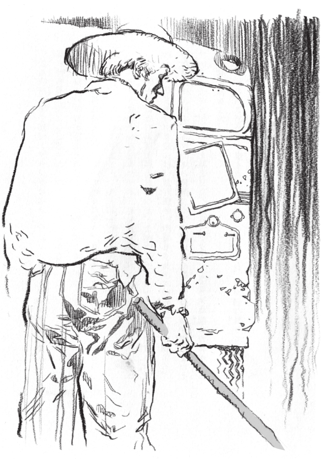 可是,铁棒并没有落在我身上。我抬头一看,伯爵从那个家伙身后握住了铁棒,两个人厮打着转到了另一侧。伯爵紧紧地握着那个男人的手,想从他手中夺下铁棒。那个男人拼命地抬腿后踢。他大声地尖叫,那叫声简直不像是人发出的。