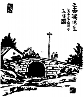 车子走了半小时以上,方才停息在田野中间跨在一条沟渠似的小河上的一爿小桥边。驾车人说:“到了,这是二十四桥。”我们下车,大家表示大失所望的样子,除了“啊哟!”以外没有别的话。一吟就拿出照相机来准备摄影。驾车的人看见了,打着土白交谈:“来照相的。”“要修桥吧?”“要开河吧?”我不辩解,我就冒充了工程师,倒是省事。驾车人到树荫下去休息吸烟了。我有些不放心:这小桥到底是否二十四桥?为欲考证确实,我跑到附近田野里一位正在工作的农人那里,向他叩问:“同志,这是什么桥?”他回答说:“二十四桥。”我还不放心,又跑到桥旁一间小屋子门口,望见里面一位白头老婆婆坐着做针线,我又问:“请问老婆婆,这是什么桥?”老婆婆干脆地说:“廿四桥。”这才放心,我们就替二十四桥拍照。桥下水涸,最狭处不过七八尺,新枚跨了过去,嘴里念着“波心荡冷月无声”,大家不觉失笑。