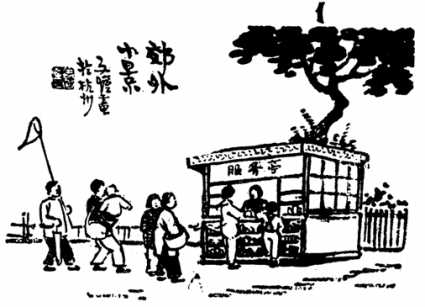 我从青年时代起就爱画画,特别喜欢画人物,画的时候一定要写生,写生的大部分是杭州的人物。我常常带了速写簿到湖滨去坐茶馆,一定要坐在靠窗的栏杆边,这才可以看了马路上的人物而写生。湖山喜雨台最常去,因为楼低路广,望到马路上同平视差不多。西园少去,因为楼高路狭,望下来看见的有些鸟瞰形,不宜于写生。茶楼上写生的主要好处,就是被写的人不得知,因而姿态很自然,可以入画。马路上的人,谁仰起头来看我呢?