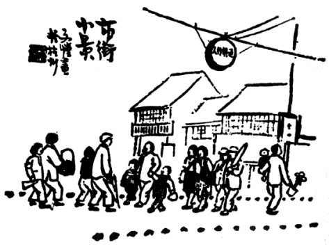 围着看的人当然也有,然而态度和从前不同了。大都知道这是“写生”,就不用看戏法的态度对待我了。大都肃静地站在我后面,低声地互相说话:“壁报上用的。”“上海去登报的。”(他们从我同游的人身上看得出我们是上海来的。)有时几个青年还用“观摩”的态度看我作画,低声地说“内行”的话;倘有小孩子吵闹,他们代我阻止,给我方便。这些青年大概也会作画。现在作画的不一定是美术学校学生,一般机关团体里都有画家,壁报上和黑板报上不是常常有很好的画出现吗?