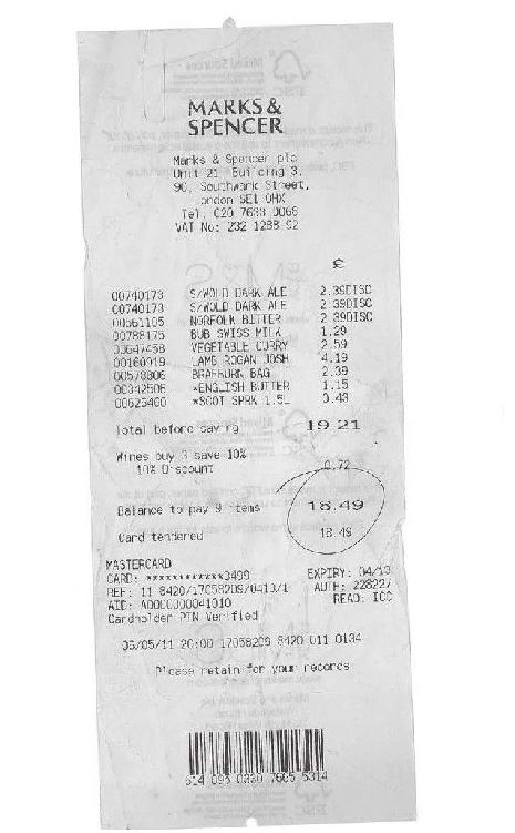 这是2011年我儿子拉兹洛出生前三天,我去马莎百货购物后拿到的发票。我老婆露比这一胎怀得很辛苦。她怀孕时很想喝啤酒却不能喝,所以逼我替她喝。有时她实在太想喝了,我一晚上就得干掉三罐啤酒(附图的发票就是证明),而且我每喝一口,她都会在旁边满脸渴望又怨怼地瞪着我。