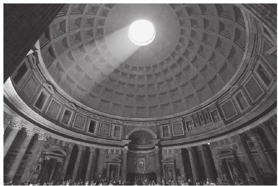混凝土的问世,让建筑师的想象力得以尽情驰骋。古罗马人发明混凝土后,立刻明白可以用它来奠立帝国的根基。他们可以在任何地方兴建港口,因为混凝土在水下也能凝固。他们还可以兴建沟渠和桥梁,而这些基础建设又能把混凝土运送到任何有需要的地方,不必仰赖当地的石头和黏土。因此,混凝土很适合打造帝国。不过,古罗马最宏伟的混凝土工程就在首都,也就是罗马万神殿的穹顶(下图)。它完工两千年来始终屹立不倒,至今仍是世界上最大的无钢筋混凝土圆顶建筑。