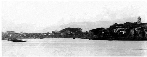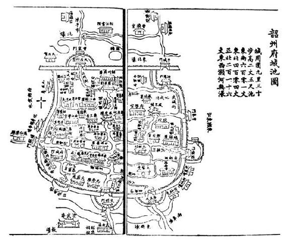 韶州城坐落在两条通航的河流之间,两河在此处汇合……筑有围墙的城镇建立在两河中间的平原上。地势如此,城镇本身无法扩展,于是他们向两方跨河扩大居民区。西岸人口更稠密,有舟桥把它和岛镇连接起来。