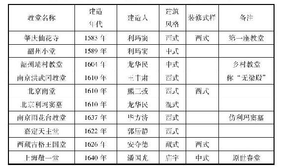 在中国内地的天主教建筑来源有两种:一种是借用已有佛寺或住宅;另一种是新建,有中国传统式及西洋式风格。天主教最初进入中国内地时举步维艰,传教士只求有立足之地。所以,当时的居住场所常常是借用在中国已较为普遍存在的佛寺或普通民宅,而每当传教稍有起色时,传教士们就试图建造新教堂。然而,教堂采用中国传统式建筑风格还是西洋式建筑风格?这一直是令利玛窦等天主教传教士伤透脑筋之事。在此期间,虽然各地时有教案发生,但天主教建筑的发展还是进入了相对稳定的阶段。当时中国还没有专门的针对西方建筑的设计师职业,传教士们及中国上层信徒(如徐光启、李之藻、孙元化等人)自己充当了建筑设计师这个角色,并且在教堂形式问题上做了自发的探索,使得中、西式教堂建筑交替出现(39)。