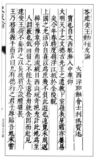 窦也,自太西航海入中华,仰大明天子之文德,古先王之遗教,卜室岭表,星霜亦屡易矣。今年春时,度岭浮江,抵于金陵,观上国之光,沾沾自喜,以为庶几不负此游也。远览未周,返棹至豫章,停舟南浦,纵目西山,玩奇挹秀,计此地为至人渊薮也。低回留之不能去,遂舍舟就舍,因而赴见建安王。荷不鄙许之以长揖,宾序设醴欢甚。王乃移席握手而言:“凡有德行之君子,辱临吾地,未尝不请而友且敬之。西邦为道义之邦,愿闻其交友道何如。”窦退而从述曩少所闻,辑成友道一帙,敬陈于左。吾友非他,即我之半,乃第二我也,故当视友如己焉。(1)