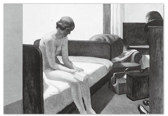 在路边的小餐馆和深夜的自助餐厅、旅馆大堂和车站的咖啡馆,我们可能会冲淡那种在一个孤立的公共场所油然而生的孤独感,反倒重新找到一种独特的群体感。家庭氛围的缺乏、明亮的灯光和毫无特色的陈设能够让人们从家庭虚假的舒适中解放出来。同家里挂着相框和贴着壁纸的客厅相比,在这些地方,我们更容易被忧伤所支配——这种像避难所的装设更能让我们放松。霍珀作品中的人物并不反对家庭本身,真实情况仅仅是,由于各种不明的原因,家庭似乎背叛了他们,迫使他们步入夜的孤独或漂泊在路上。对于那些因为高尚的原因而不能在这个平凡的世界找到一个家的人来说,全天候开放的小餐馆、车站的候车室和汽车旅馆便是他们的避难所。
