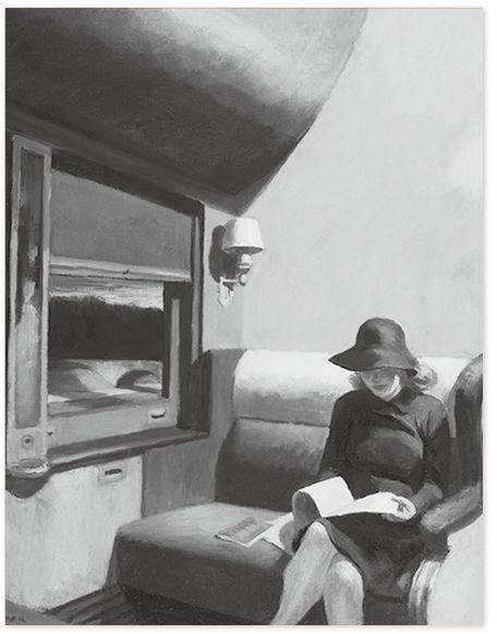 霍珀对汽车和火车也同样情有独钟。旅行似乎能够让我们沉浸在某种内省的情绪中,霍珀就是被这种情绪所吸引。他喜欢捕捉火车穿越风景地时半空的车厢里的气氛:只听见车轮有节奏地敲打铁轨的声音,车厢里则一片沉寂,车外的声音和窗外的风景形成一种梦幻般的场景,身处其中,我们似乎摆脱了通常的自我,拥有了一些在安定环境下无法拥有的思想和记忆。霍珀的《293号车厢C舱》(Compartment C, Car 293,1938)中的妇女似乎就沉浸在这种情绪中,看着书,眼光在车厢和风景之间来回游弋。
