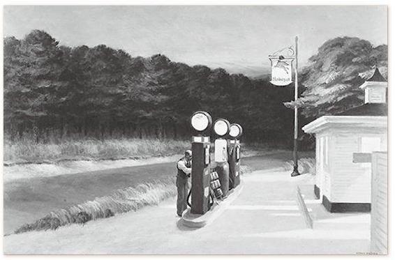 服务站总是让我想起霍珀的《加油站》(Gas,1940),创作时间晚于《自助餐厅》13年,与其早期画作一样,同样探讨孤独。我们看到一座加油站孤零零地立于即将降临的夜色之中。但是在霍珀的笔下,这种孤独再次令人忧伤、令人神往。黑暗像浓雾一般,从画面的右边蔓延开来,预示着某种恐惧,与加油站象征的安全形成鲜明对照。在黑夜与荒野森林的背景下,在这人类最后的堡垒中,应该比白天的城市更容易让人生出亲近的感觉。咖啡机和杂志,两样人类微小欲望和虚荣的象征物,对应着加油站外宽阔无垠的非人类的世界和绵亘数英里的森林,而在这森林里,不时可以听见熊和狐狸行走时将脚下的树枝踩断的声音。杂志封面上用亮粉红色的字体向我们建议,我们在这个夏天应该把指甲涂成紫色;咖啡机上方写有提示,邀我们品尝刚刚烘焙的喷香咖啡豆,在这些建议和提示中,有种令人感动的东西。在这道路即将延伸进无边森林的最后一站,我们与他人的共同点被空前放大,远甚我们的不同之处。