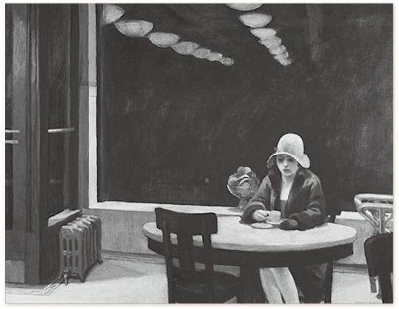 在《自助餐厅》(Automat,1927)这幅画中,一位女士独坐一隅,喝着咖啡。天色已晚,从她头戴的帽子和身穿的衣服判断,户外异常寒冷。房间显得很宽敞,灯光明亮,空空荡荡。室内装修完全是实用性的,石头桌面的餐桌,耐磨的黑色木椅,白色的墙壁。女士看起来有点拘谨、有些胆怯,不习惯独自坐在公共场所。她的身上似乎发生了什么变故。她使观众不由自主地想象关于她的故事——背叛或失去的故事。她端起咖啡送往唇边,竭力让手不要发抖。这或许是在一个北美大城市、2月的某个晚上11点。