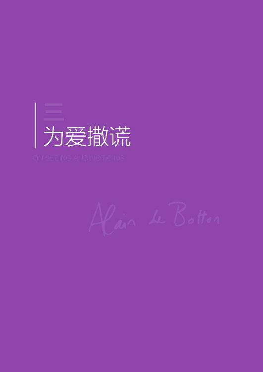18.我的谎言,尽管被逼无奈,但还是令我羞惭不已,让我认清两种谎言:为了逃避的谎言和为了获得爱情的谎言。求爱的谎言和其他方面的谎言都截然不同。如果我向警察撒谎,隐瞒被拦住时的车速,我这样做有一个相当直接的动机,逃避罚款和坐牢。但为了求爱撒谎却有一个非常怪异的假设:如果我不撒谎,我将不会获得爱情。认为要诱惑意中人就得消除所有个性[因此也可能会事与愿违],认为真正的自我不可避免地会与意中人心目中的完美形象相冲突( 因而配不上意中人心目中的完美)。