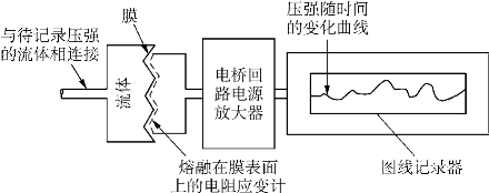传感器是将任何一种形式的能量从一个系统传送到另一个系统的器件。电阻式压力传感器将一个机械系统(通常是一个金属膜)的位移转变成电信号,不管是其本身主动产生电输出量还是要求一个电输入量来被动地修改机械位移的函数。有一类压力传感器,电阻应变计是贴在一块膜上的,如图2-16所示。当压强变化时,膜的移动量也改变,而这又改变了电输出量。通过适当地校正,即可提供压强数据。如果将这种器件和一个走带式图线记录器连接起来,即可用它来给出连续的压强记录。若不用走带式图线记录器,也可以用计算机数据识别系统按固定的时间间隔,在一个磁带或磁盘上记录这种数据,还可以用数码形式将其显示在一个屏幕上。