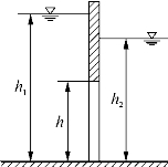 2-9 如图223所示,有一矩形底孔阀门,高h=3 m,宽b=2 m,上游水深h 1=6 m,下游水深h 2= 5 m。试求作用于阀门上的水静压力及作用点。