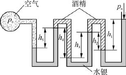2-6 为了测得较大的压强且便于观察,有时利用如图所示的测压管组。若h 1=0.7 m,h 2= 0.65 m,h 3=0.68 m,h 4=0.72 m,h 5=0.66 m,ρ水银=13 600 kg/m3酒精=800 kg/m3,不计空气质量,求空气室内相对压强p 0。若仅用一个U形管,当注满水银后测量同样的压强p 0,则需多长的测压管?