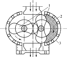 旋转式鼓风机类型很多,罗茨鼓风机是其中应用最广的一种。罗茨鼓风机的结构如图721所示,其工作原理与齿轮泵极为相似。因转子端部与机壳、转子与转子之间缝隙很小,当转子作旋转运动时,可将机壳与转子之间的气体强行排出,两转子的旋转方向相反,可将气体从一侧吸入,从另一侧排出。如改变转子的旋转方向,可使吸入口与排出口互换。