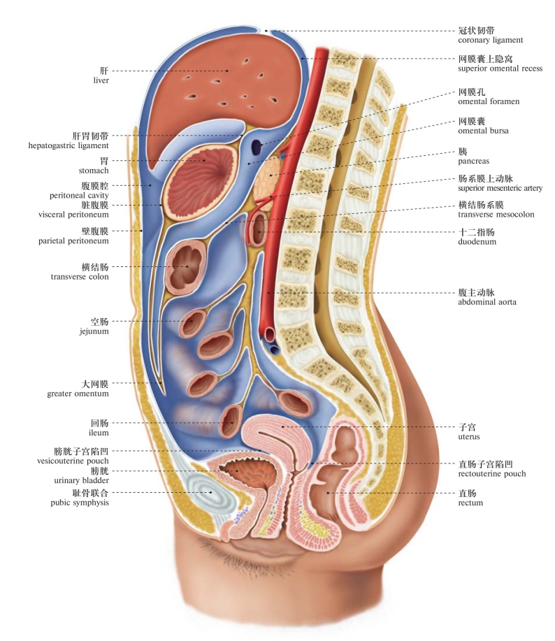 Median sagittal section of female abdominal cavity (show vertical arrangement of peritoneum)