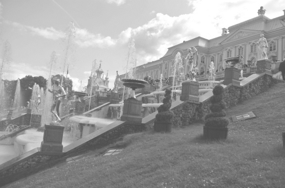 在圣彼得堡,我们最后的目的地是彼得霍夫宫。中国人俗称这里为“夏宫”。因为这个不太准确的称呼,我们差一点和彼得霍夫宫失之交臂,因为我们是自助游,所有的景点都是自己在网上查到的。在网上查到的“夏宫”就是彼得堡市区的“夏花园”。夏花园里也有比较漂亮的喷泉,并且也有很多雕像,可是无论规模还是气势都无法和彼得霍夫宫相媲美。所以我们在浏览了夏花园后,总觉得意犹未尽,好像不远的地方还有一处仙境没有游到,于是我们继续在地图上寻找目的地,终于查到了梦想已久的彼得霍夫宫。彼得霍夫宫是彼得大帝建造的郊外夏宫,紧邻海边,通过一小段运河直接连接到芬兰湾。借着水边的地理优势,它有着最绚烂夺目的大喷泉和中央宫殿,所有的雕像都是铜质镀金,修缮一新的宫殿屋顶也是镀金的,看起来豪华至极。它的宫殿是沙皇举办舞会和宫廷庆典活动的地方。它的花园分为上花园和下花园,宫殿坐落在上花园,面对着下花园,巨大的喷泉群就是下花园的核心景观。各种造型的金色喷泉喷洒出的水花,在阳光的照射下,闪耀着迷人的光辉。