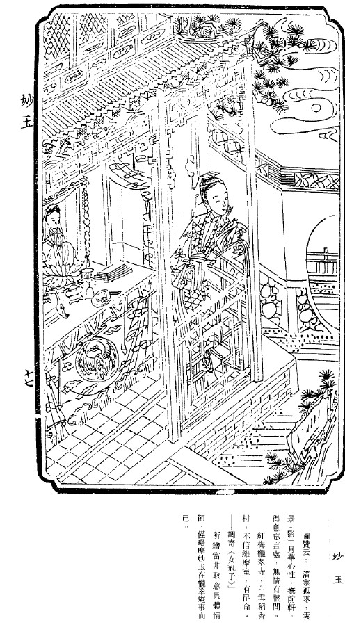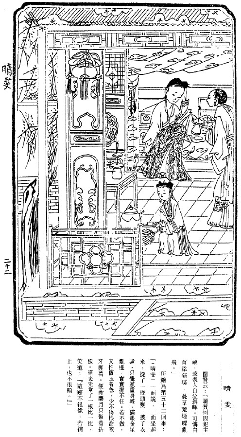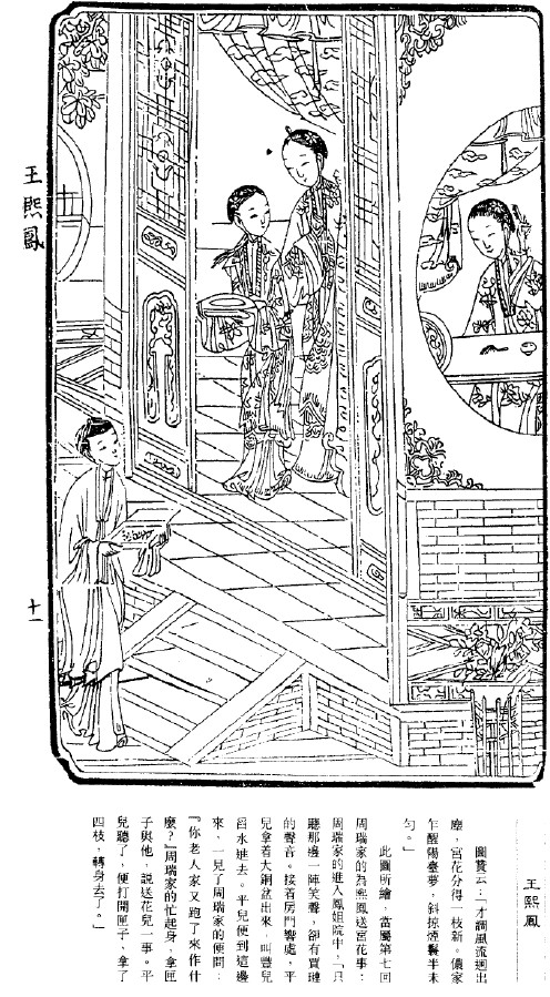 《红楼梦》版刻插图始自乾隆五十六年(1791)萃文书屋活字本之《新撰全部绣像红楼梦》,亦即通常所说的“程甲本”。所谓“绣像”,是一种有中国特色的版刻艺术,于刻印图书时在卷首冠以书中人物之图像,既增加图书之美观,亦增强阅读之兴趣,可以促进图书之销售。