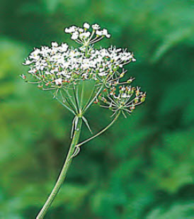 形态:多年生草本。茎直立,中空,表面有纵直沟纹。叶互生。复伞形花序,顶生或腋生,白色。双悬果广卵形,无毛。