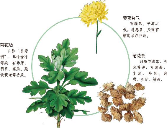 菊的种类非常多,茎、叶、花、色,各不相同。其茎有株蔓、紫赤、青绿的差别;叶有大小、厚薄、尖秃之异;花有千叶单叶、有蕊无蕊、有子无子、黄白红紫、杂色深浅、大小之别;味有甘、苦、辛之辨。还有夏菊、秋菊、冬菊之分。菊花可用来泡茶和入药,疏散风热宜用黄菊花,平肝、清肝明目宜用白菊花。
