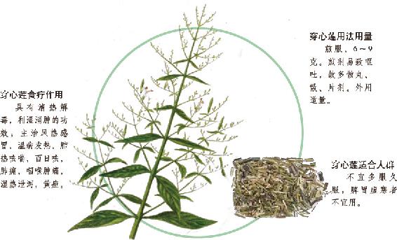 穿心莲具有消炎解毒作用,临床上曾应用于多种感染性疾病,包括外伤感染、疖、痈、丹毒、上呼吸道感染、急慢性扁桃体炎、急慢性咽喉炎、急慢性支气管炎、急性菌痢、急性胃肠炎、尿路感染、子宫内膜炎、盆腔炎、中耳炎、牙周炎等,均有不同程度的疗效。