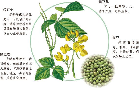 绿豆,煎汤,15~30克;研末或生研绞汁。