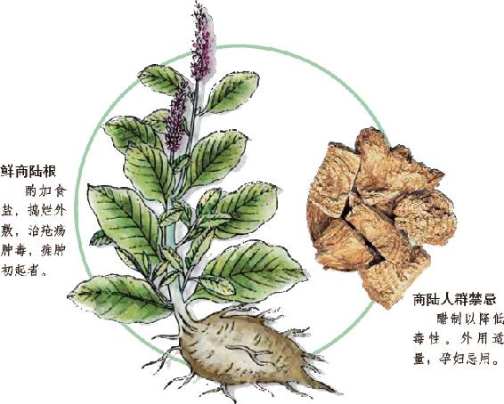 商陆根和盐少许,捣碎外敷,几日即愈。
