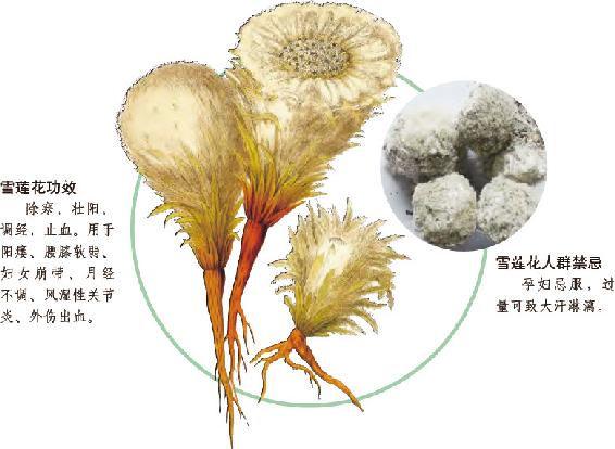 入药部位:雪莲花、鼠曲雪莲花、水母雪莲花等的带花全株