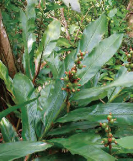 形态:艳山姜,多年生常绿草本。叶大,互生;叶片披针形。圆锥花序呈总状花序式,下垂,蒴果卵圆形,具显露的纵向条纹,熟时朱红色;种子有棱角。