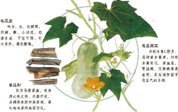 瓜嫩时绿色有毛,熟后则呈青色,皮坚厚有粉,瓜肉肥白。瓜瓤叫做瓜练,像絮一样白而虚松,可用来洗衣服。瓤中的子叫瓜犀,排列生长。在霜后摘下冬瓜,瓜肉可以煮吃,也可加蜜糖制成果脯;子仁也可食用。可兼蔬菜、果品用。收割后的冬瓜应避免接触酒、漆、麝香和糯米,否则必烂。